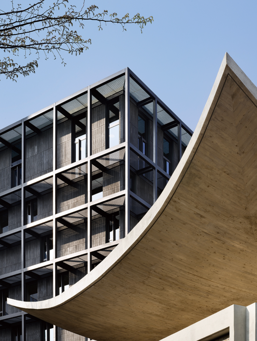 라 주테의 넓은 캐노피는 방문객을 맞이하는 상징적 입구이자, 하늘을 프레이밍하는 장치로 설계 되었다. 그 아래에서 올려다보면 직선과 곡선의 처마가 맞물리며, 마치 김중업이 의도한 하늘을 다시 보는 듯한 인상을 준다. 멀리서도 눈에 띄는 검은색의 라 투르의 루버와 돌출 구조체는 수평 리듬을 만들어내며 원작의 미감을 계승했고, 거칠게 드러난 용접 자국은 노출콘크리트의 질감을 현대적으로 해석한 것이다. 라 주테의 옥상정원과 외부 테라스에는 경사진 대지 위에서 사람과 사람이 자연스럽게 교류할 수 있는 새로운 공간을 마련했다. 새 건물은 스스로를 드러내기보다 원작을 돋보이게 하는 ‘겸손한 배경’으로서 기능한다.