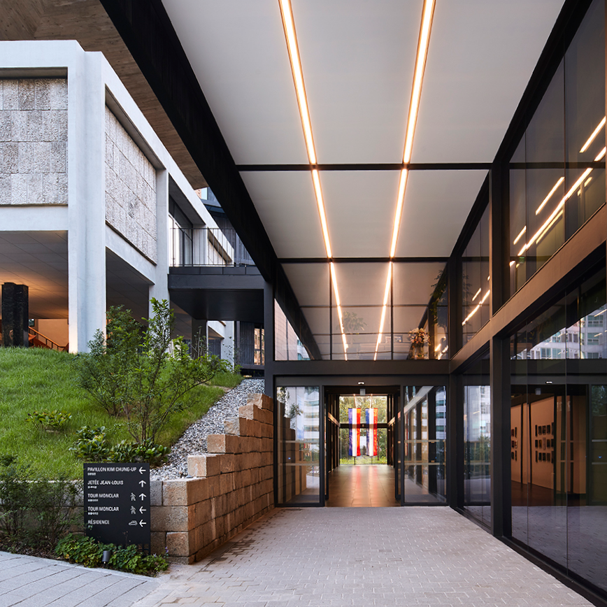 르 코르뷔지에에게서 배운 합리성과 구조, 그리고 한국적 감성을 함께 품은 프랑스대사관은 지금도 살아 있는 대화의 현장이다. 이곳은 단순한 외교시설이 아니라, 한국 건축이 세계와 나누는 언어이자 문화적 상징이다. 빛과 그림자, 전통과 현대, 과거와 미래가 교차하는 이 공간은 김중업이 남긴 가장 완전한 문장이다. 그 문장은 오늘도 남산의 바람과 함께, 천천히 그리고 단단하게 이어지고 있다.